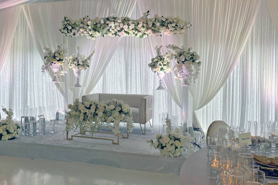 Stage Backdrops, Table Centerpieces, Floral Arrangements, Nikkah Dividers, Stage Furniture, And Overall Event Décor